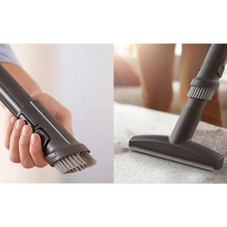 جاروبرقی فیلیپس XD8022 با مجموعهای از ویژگیهای پیشرفته، نظافت را به یک تجربه کارآمد و راحت تبدیل کرده است. یکی از قابلیتهای برجسته این مدل، نازل TriActive+ است که عملکردی چندمنظوره دارد. این نازل بهگونهای طراحی شده که همزمان سه عمل مختلف را انجام دهد؛ ابتدا پرزهای فرش را باز کرده تا گردوغبار بیشتری از بین الیاف آن خارج شود، سپس ذرات ریز و درشت را از سطح زمین جمعآوری کرده و در نهایت، با مکش از کنارهها، گردوغبار را از لبههای دیوار و کنجهای خانه به داخل جارو میکشد. این ویژگی باعث میشود که نیازی به جارو کردن مجدد گوشهها یا استفاده از سریهای اضافه نباشد. نازل سوپر پارکت یکی دیگر از امکانات مهم این مدل است که بهطور خاص برای سطوح صاف و کفهای سخت طراحی شده است. این نازل میتواند تا سه برابر بیشتر از نازلهای معمولی، گردوغبار و آلودگیهای چسبیده به کف را از بین ببرد و سطوحی کاملاً تمیز و براق بر جای بگذارد.