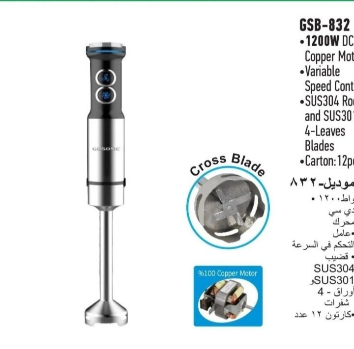 به منظور افزایش سرعت عمل گوشت کوب تک کاره گوسونیک مدل GSB-832 در ساختار آن موتور پر قدرت با توان 1200 وات dc به کار رفت است.