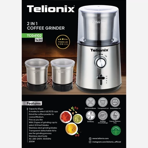 آسیاب قهوه مغزیجات تلیونیکس آلمان مدل TCG4102 با ظرفیت 85 گرم دو مخزن استیل با گارانتی یکساله
