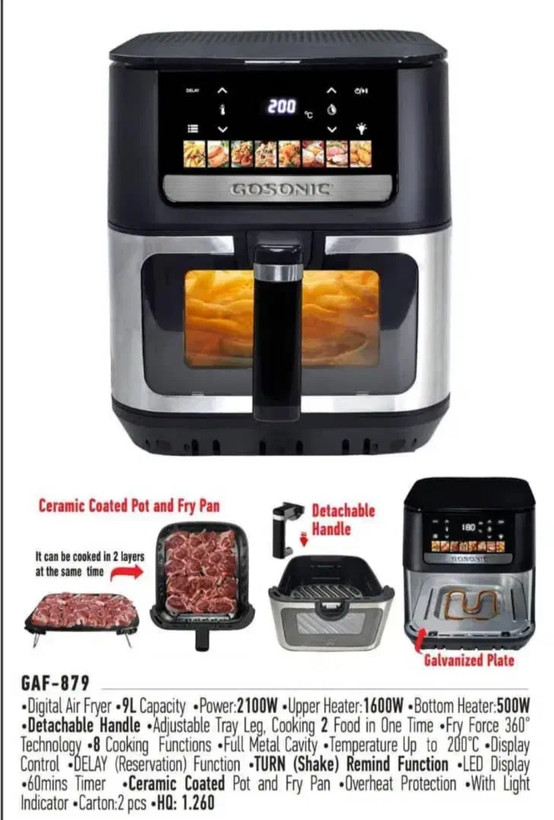 سرخ کن گوسونیک مدل GAF-879 توان مصرفی 2100 وات که از دو المنت 1600 وات بالا اصلی به علاوه 500 وات پایین تأمین میشود، این سرخ کن گرمای یکنواخت تولید کرده و زمان آمادهسازی را کوتاه میکند. کنترل پنل لمسی با نمایشگر دیجیتال، کاربری را لذتبخش میسازد.