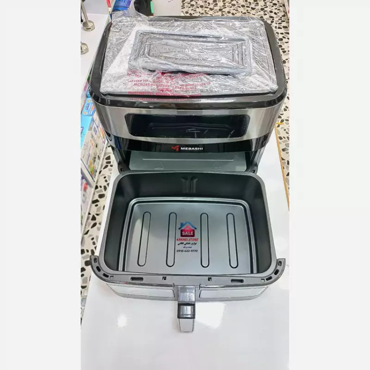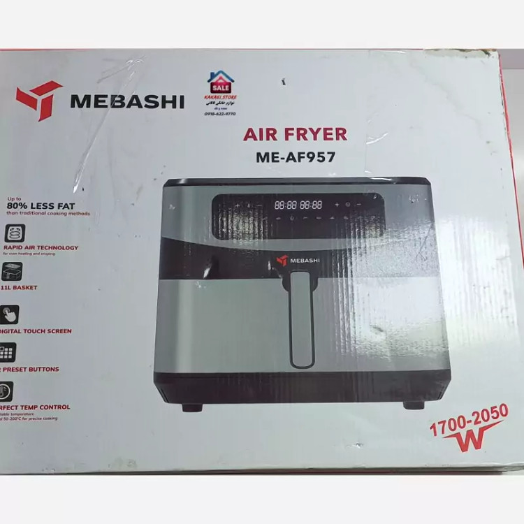 سرخ کن بدون روغن مباشی ME-AF958 ME-AF957 تحت لیسانس ژاپن ظرفیت سبد 11 لیتری جنس تفلون نچسپ دارای سبد شیشهای جهت دیدن پخت مواد غذایی و سبد استیل توان 2050 وات پنل دیجیتالی لمسی بدنه داخلی گالوانیزه دارای جدا کننده سبد سیستم گرمایشی تکنولوژی Rapid Air برای گردش سریع هوا و کاهش بو در هنگام سرخ کردن قابلیت تنظیم دما از 50 تا 200 درجه دارای تایمر قابل تنظیم 60 دقیقه ایی دارای برنامه پخت متنوع سیستم خاموشی خودکار و فن تهویه با ظرفیت 11 لیتری و طراحی چندکاره این سرخ کن، شما میتوانید همزمان چند نوع غذا را بپزید دارای دو پنجره برای دید مواد غذایی 11 برنامه پخت متنوع، سیستم خاموشی خودکار، مدل پنجره شفاف برای کنترل کامل روند پخت