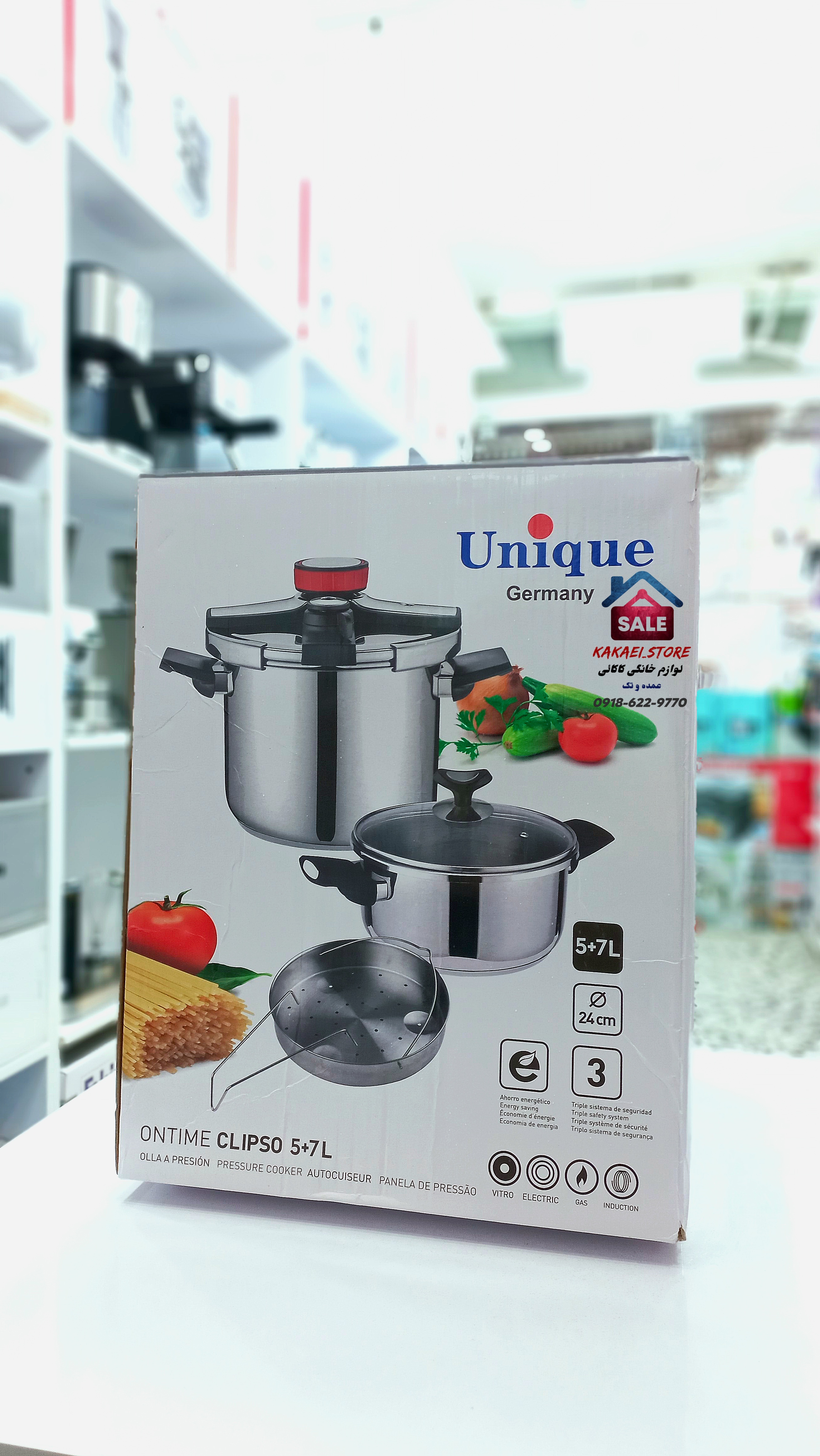 زودپز دوقلو یونیک 7و5 لیتری یونیک آلمانی درب کلیپسی حکاکی شده کیفیت عالی